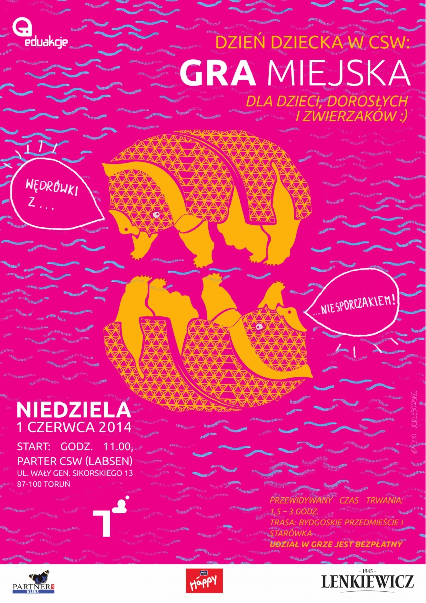 Jak co roku CSW przygotowało dla małych (i większych) mieszkańców Torunia coś bardzo specjalnego. Czy wiecie, gdzie na toruńskiej Starówce znaleźć można smoka, lwa albo papugę? Gdzie na Bydgoskim Przedmieściu czai się lis? Podczas WĘDRÓWEK Z NIESPORCZAKIEM nie tylko odnajdziecie różne fantastyczne stworzenia, ale dowiecie się także wiele o współczesnej architekturze! Wstęp jest wolny, a na zwycięskich wędrowców czeka pyszna nagroda w kawiarni Lenkiewicz! WĘDROWKI Z NIESPORCZAKIEM – mikroskopijnym stworzeniem, które jest w stanie przetrwać najstraszniejszą katastrofę i co więcej, stało się inspiracją współczesnych artystów i architektów. NIESPORCZAK zaprosi nas do gry miejskiej: na wyznaczonej przez niego trasie, wiodącej przez toruńską Starówkę i Bydgoskie Przedmieście, będziecie musieli znaleźć kolejne zwierzaki i fantastyczne stworzenia, które na co dzień ukrywają się w tkance miasta. Jeśli uda się Wam wykonać wszystkie zadania NIESPORCZAKA, czeka Was pyszna nagroda w kawiarni Lenkiewicz! Trasa: Bydgoskie Przedmieście i Starówka, pierwsza grupa (trasa łatwa, dzieci do 8 lat), druga grupa ( trasa trudniejsza, dzieci powyżej 8 lat).