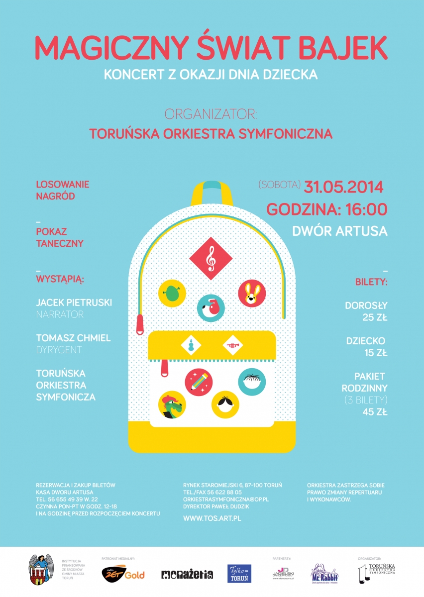 - godz. 16:00, Sala Wielka Dworu Artusa, Toruńska Orkiestra Symfoniczna, Magiczny Świat Bajek, Koncert z okazji Dnia Dziecka, bilety: 25 zł (dorosły), 15 zł (dziecko), 45 zł (pakiet rodzinny – 3 bilety)