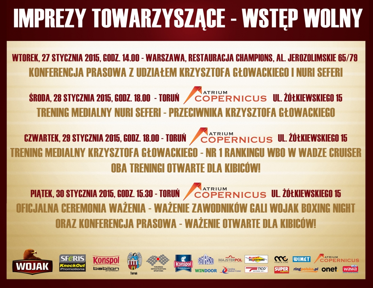 31 stycznia za sprawą gali Wojak Boxing Night wielki boks zawita do hali sportowo-widowiskowej w Toruniu. Głównym wydarzeniem wieczoru będzie walka eliminacyjna (tzw. Final Eliminator) do tytułu mistrza świata WBO wagi junior ciężkiej pomiędzy Krzysztofem Głowackim i Nurim Seferim.
