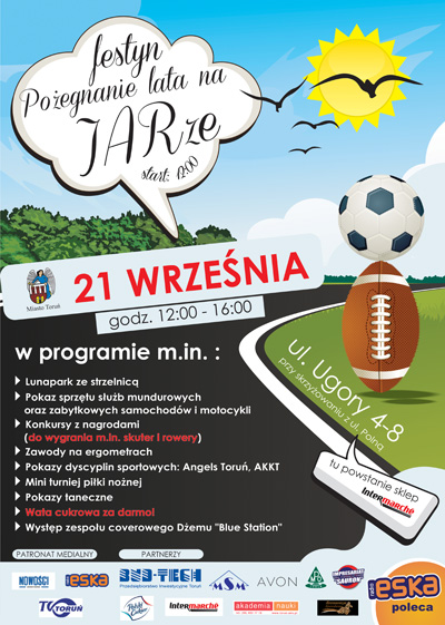Skuter, rowery i kurs angielskiego w nagrodę, cukrowa wata za darmo, zabytkowe pojazdy, rugby, dużo muzyki i wiele innych atrakcji. 21 września 2013 r. na osiedlu JAR w Toruniu wielki festyn dla mieszkańców i nie tylko „Pożegnanie lata na JAR-ze”.