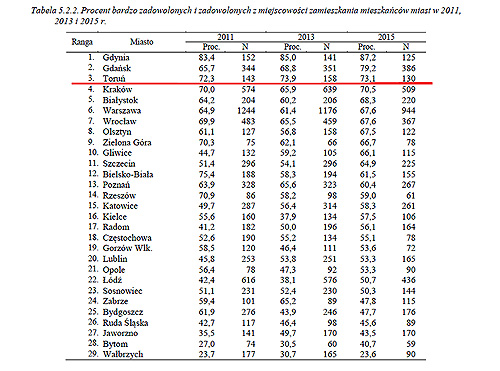Po raz kolejny Toruń wysoko oceniony w "Diagnozie Społecznej 2015". Z odsetkiem 73,1 proc. osób zadowolonych z życia w mieście uplasował się na trzecim miejscu za Gdynią (87,2 proc.) i Gdańskiem (79,2 proc.).
