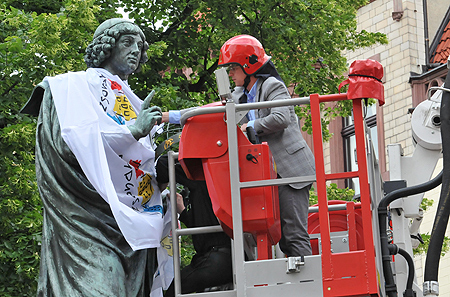 Na pociechę mieszkańcom Torunia dodamy, że nakładanie bydgoskiej koszulki Kopernikowi z podnośnika strażackiego nie poszło sąsiadom łatwo. Astronom bronił się za pomocą astrolabium przed upięciem szaty z herbem Bydgoszczy i w pierwszej wersji otwór na głowę wylądował dokładnie na wysokości serca Mikołaja, które pozostało niezakryte, czyli toruńskie. Ostatecznie szata przybrała kształt peleryny. Zgodnie z warunkami zakładu pozostanie na pomniku do 28 maja do godz. 15.00.