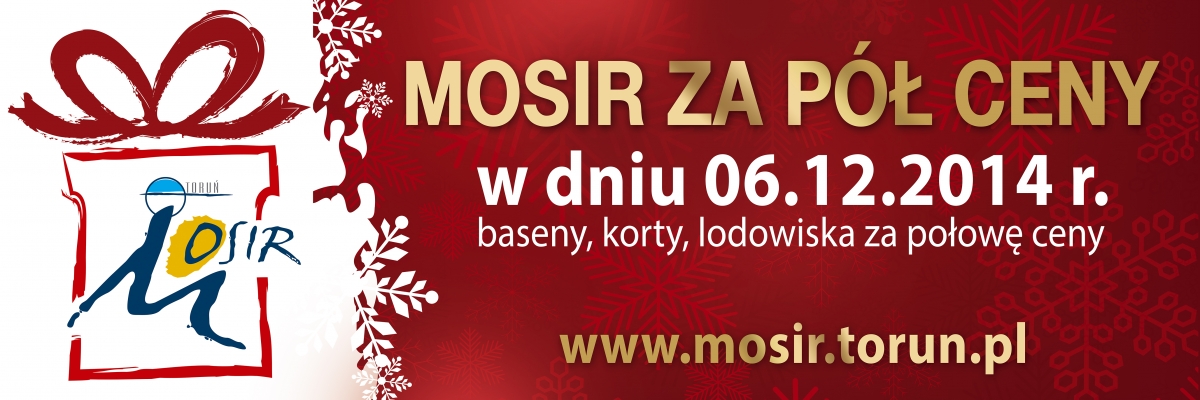 Miejski Ośrodek Sportu i Rekreacji w Toruniu 6 grudnia wprowadza 50% zniżki dla korzystających w tym dniu z obiektów MOSIR: basenów, lodowisk, kortów (korty dostępne zgodnie z harmonogramem, po rezerwacji telefonicznej :56 477 91 46 lub 606 804 377).