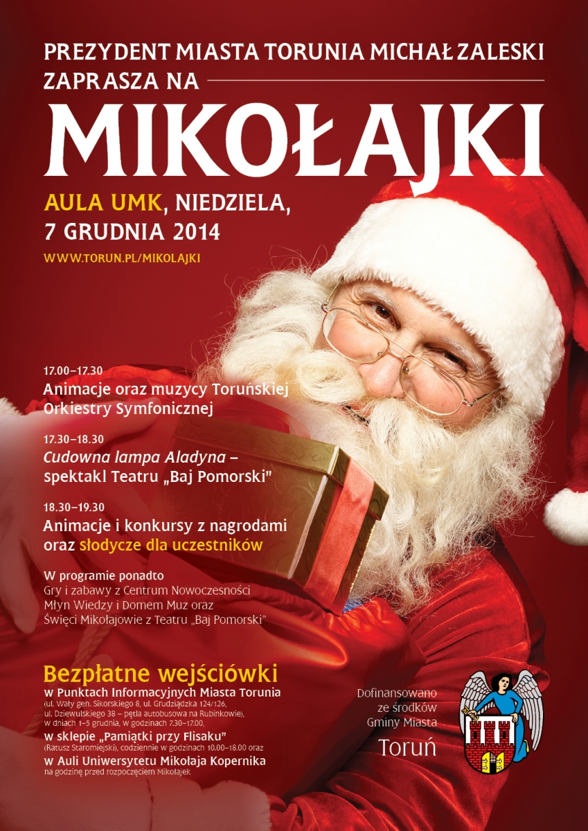 Nie jeden, a kilku Świętych Mikołajów, słodkie upominki dla dzieci, spektakl o niezwykłych przygodach Aladyna, interaktywna zabawa podczas której dzieci będą mogły zbudować zamek, tunel, a nawet… akwedukt! — moc atrakcji będzie towarzyszyć wyjątkowym Mikołajkom, które odbędą się w niedzielę, 7 grudnia 2014 roku w Auli UMK, w godzinach 17.00–19.30. Na Mikołajki zaprasza Prezydent Miasta Torunia Michał Zaleski. Wstęp na wydarzenie jest wolny.