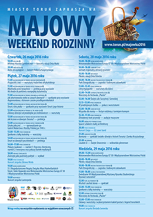 Koncerty zespołów Zdrowa Woda, Exigo i Biesiada Lwowska, warsztaty artystyczne i pokazy naukowe dla najmłodszych, a także jarmark regionalny, festyn i piknik rodzinny oraz Motorowodne Mistrzostwa Europy - to tylko niektóre z licznych atrakcji przygotowanych dla mieszkańców Torunia i turystów z okazji majowego weekendu rodzinnego, który odbędzie się w Toruniu w dniach 26–29 maja 2016 roku.