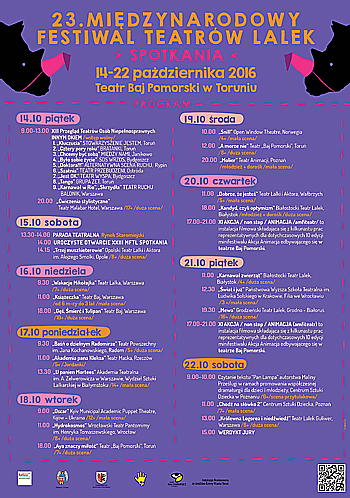 Toruński Baj Pomorski zaprasza 14-22 października 2016 r. na Międzynarodowy Festiwal Teatrów Lalek "Spotkania". Jak co roku wydarzeniu towarzyszyć będzie parada aktorów i lalek na Rynku Staromiejskim - w sobotę, 15 października o godz. 14:00.