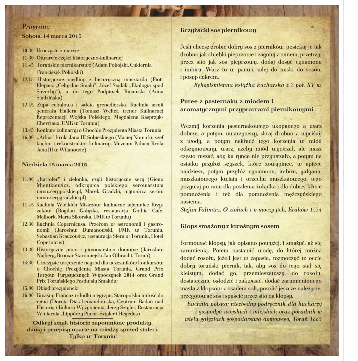- 11.45 – Kuchnia Wielkich Mistrzów: kulinarne tajemnice Krzyżaków (Bogdan Gałązka, restauracja Gothic Cafe, Malbork; Marta Sikorska, UMK Toruń)