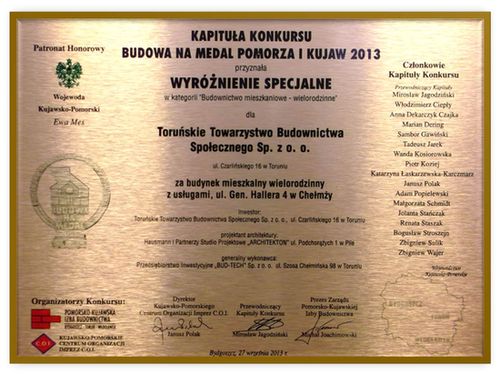 Toruńskie Towarzystwo Budownictwa Społecznego Sp. z o.o. otrzymało wyróżnienie specjalne w konkursie Budowa na medal Pomorza i Kujaw 2013. Wyróżnienie zostało przyznane w kategorii Budownictwo mieszkaniowe - wielorodzinne za budynek mieszkalny wielorodzinny z usługami zlokalizowany przy ul. Hallera 4 w Chełmży.