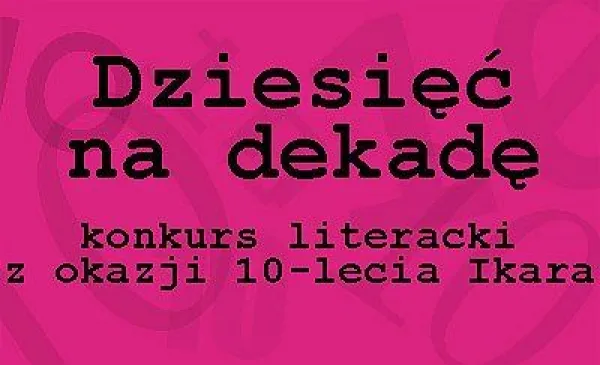 Chętnych do powalczenia o „Ikartę” zachęcamy do napisania niewielkiego (maksimum 2000 znaków ze spacjami) opowiadania lub eseju, w którym motywem przewodnim (bądź pobocznym) będzie liczba 10. Czego będzie 10 w tekstach, zależy już wyłącznie od wyobraźni autorów. Może to być 10 kilogramów cukru, 10 koralików na szyi pięknej dziewczyny, 10 przykazań dobrego księgowego, mogą to być wspomnienia z czasów, gdy miała(e)m 10 lat, lub cokolwiek innego, co podpowiada fantazja.