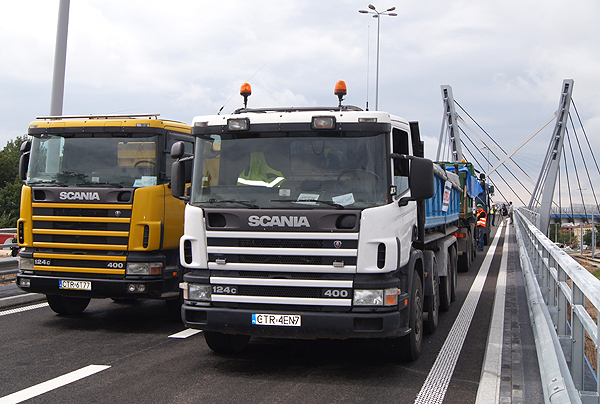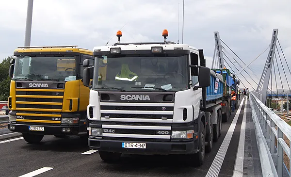 - Próbne obciążenie obiektu potrwa dwa dni. Dziś (13 sierpnia) próby będą prowadzone pomiędzy podporami P4-P7 (bliżej osiedla Rubinkowo), natomiast jutro pomiędzy podporami P1-P4 (bliżej ZDZ). Na obiekt wjedzie sześć ciężarówek, dwie z nich o masie całkowitej 34 tony, natomiast cztery o masie 35,5 ton - wyjaśnia z-ca dyrektora kontraktu oraz kierownik robót z ramienia firmy Strabag Zbigniew Szubski.