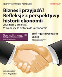Wykład wygłosi prof. Agustín González Enciso, były wicerektor Uniwersytetu Nawarry w Pampelunie. Tytuł prelekcji: „Biznes i przyjaźń? Refleksje z perspektywy historii ekonomii”. Dysputa odbędzie się w czwartek 13 czerwca o godz. 19.00 w Collegium Maximum UMK na pl. Rapackiego 1. Wstęp jest bezpłatny i otwarty dla wszystkich zainteresowanych osób.