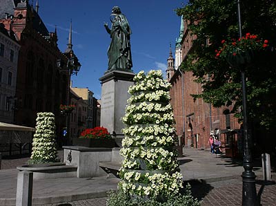 Pomnik Mikołaja Kopernika zdobią dwa stożki kwiatowe. Na wieżach kwiatowych znalazły się w tym roku różowe petunie.