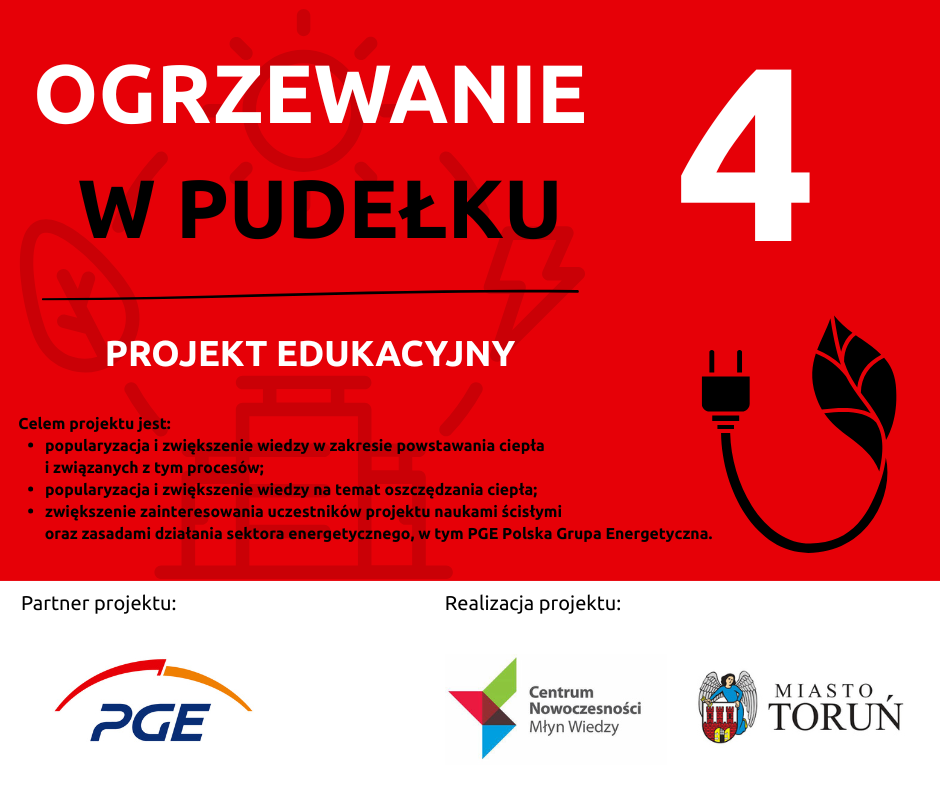 Centrum Nowoczesności Młyn Wiedzy w Toruniu wspólnie z partnerem PGE Polską Grupą Energetyczną rozpoczynają zapisy do czwartej już edycji projektu "Ogrzewanie w pudełku". Zajęcia dla uczniów są bezpłatne.
