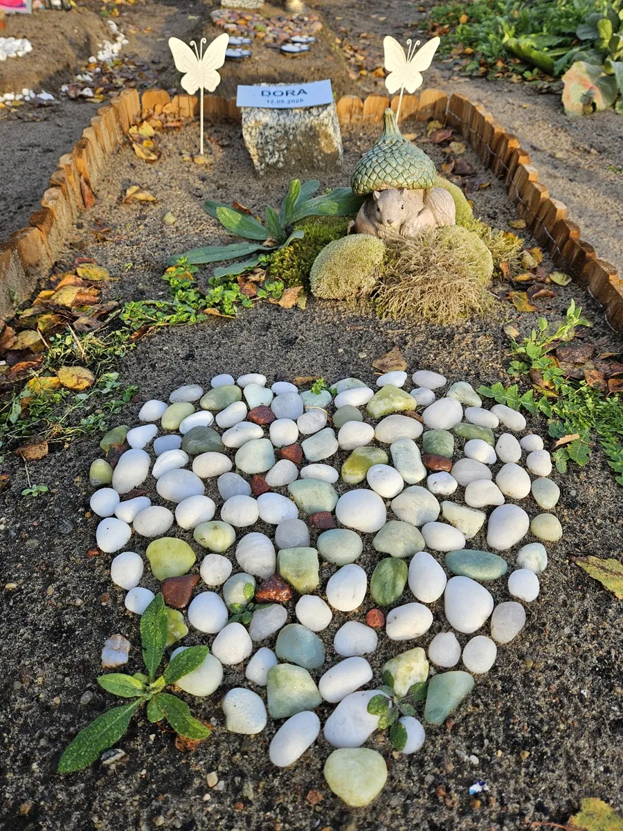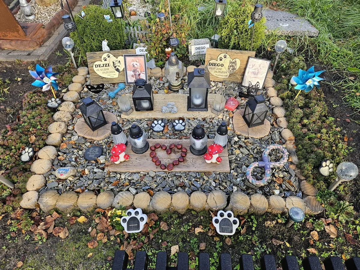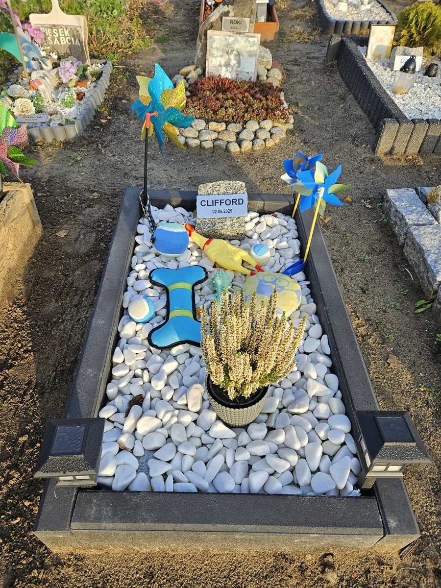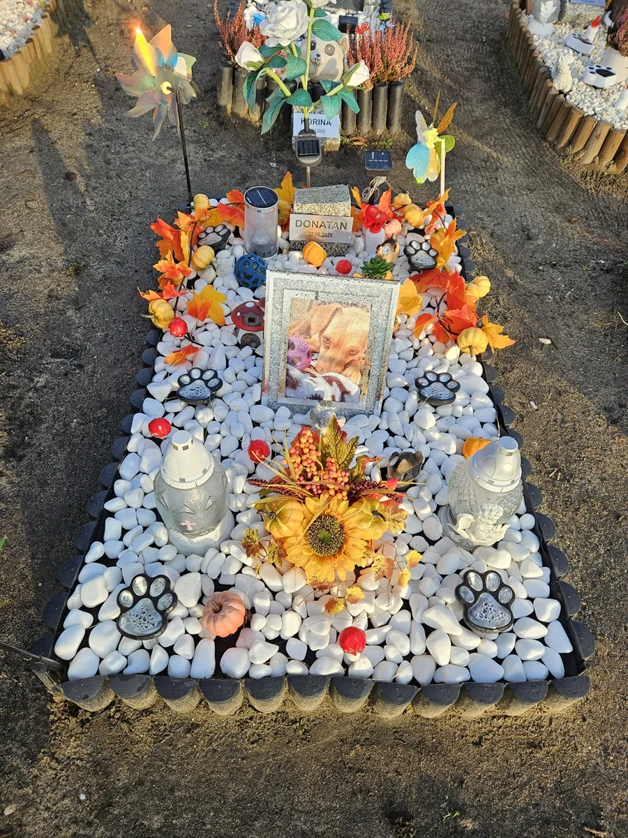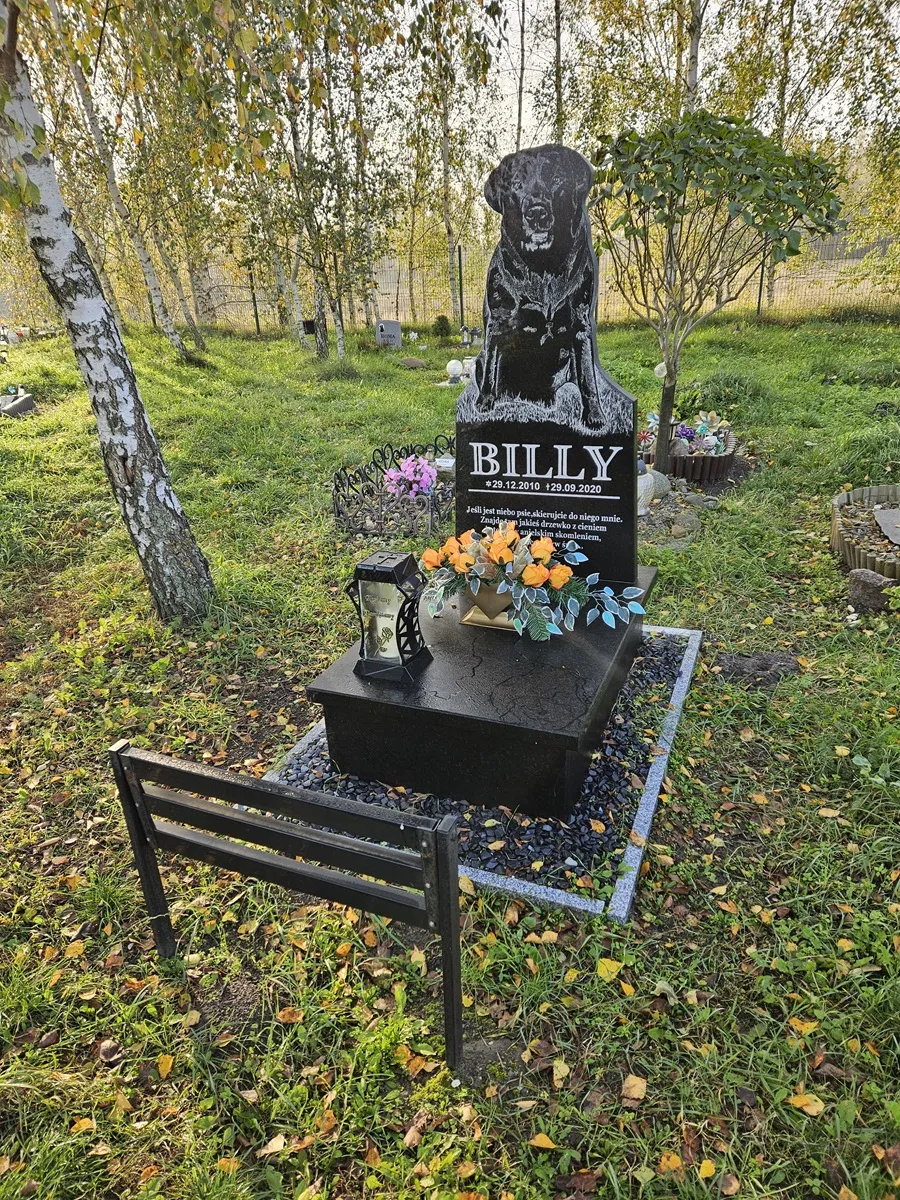 Miejsce pochówku oznaczone jest polnym kamieniem z pamiątkową tabliczką z imieniem zwierzęcia i datą pochówku