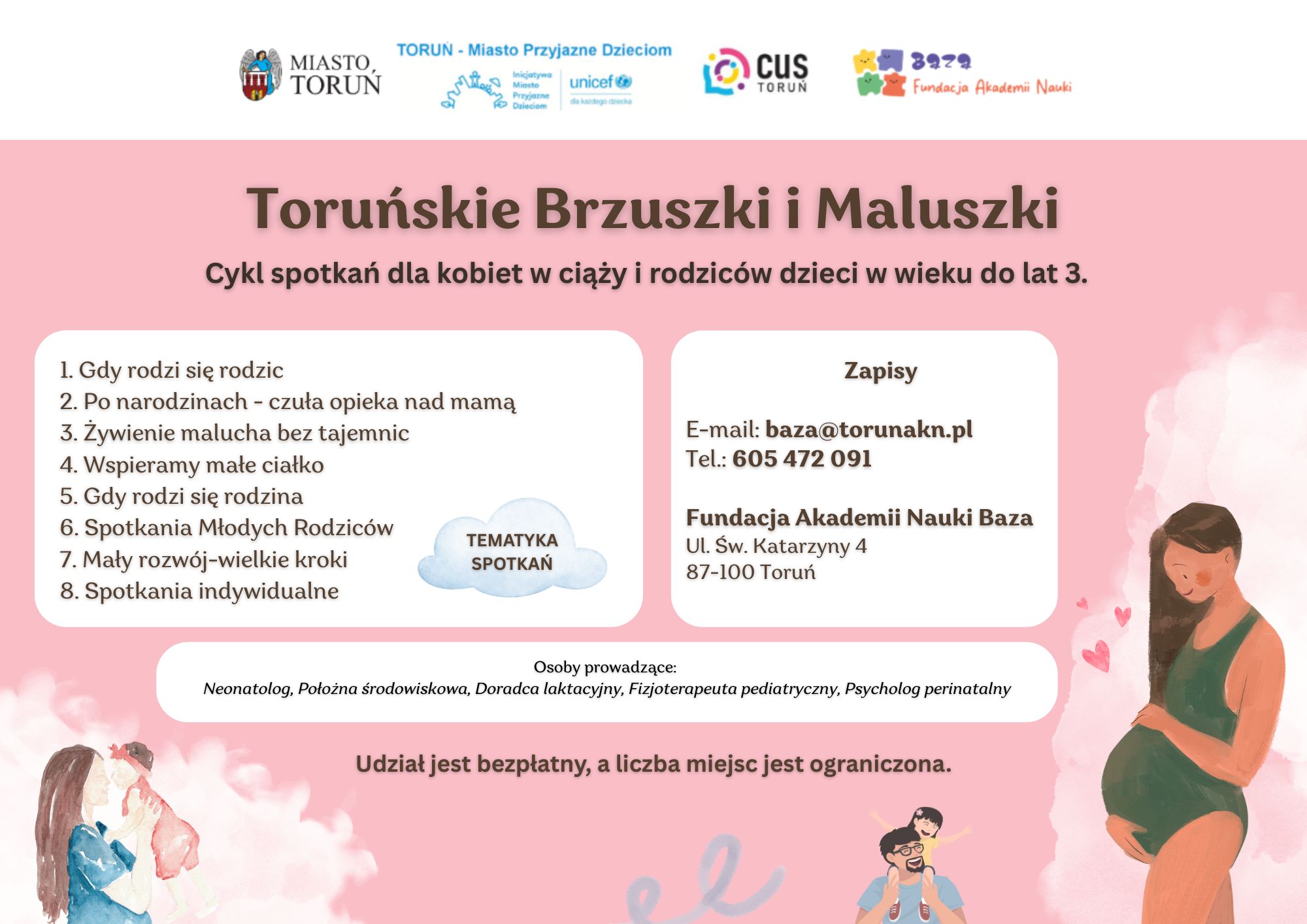 Narodziny dziecka to wyjątkowy moment w życiu każdej rodziny – pełen emocji, radości, ale też nowych pytań i wyzwań. W odpowiedzi na te potrzeby Miasto Toruń uruchamia pilotaż programu „Toruńskie Brzuszki i Maluszki” – bezpłatny cykl spotkań edukacyjnych dla kobiet w ciąży oraz rodziców dzieci do 3. roku życia, który na zlecenie Toruńskiego Centrum Usług Społecznych realizuje Fundacja „Akademii Nauki Baza” z siedzibą przy ul. Św. Katarzyny 4 w Toruniu.
