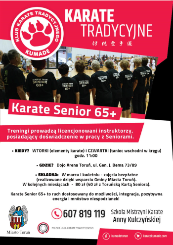 Zajęcia Senior 65+, realizowane dzięki wsparciu Gminy Miasta Toruń, to doskonały sposób aktywizacji osób starszych. Ćwiczenia, prowadzone przez instruktorów posiadających wieloletnie doświadczenie w pracy z najdojrzalszymi adeptami sztuk walki, są dobierane z delikatnością i uważnością na schorzenia, z jakimi borykają się trenujący. Karate dla tej, jakże specyficznej grupy wiekowej, to głównie ćwiczenia ogólnorozwojowe i wzmacniające. Seniorzy uczą się podstawowych chwytów i bloków, jednakże dalekie jest to od wyobrażenia „rzucania na matę” i ruchów niczym Bruce Lee. Treningi odbywają się w spokojnej atmosferze, która sprzyja integracji i zawieraniu nowych przyjaźni wokół wspólnej pasji. Duży nacisk stawiany jest na wyciszenie, metody skupiania uwagi, techniki rozluźniające oraz relaksacyjne. Pomaga to naszym Seniorom w codziennym funkcjonowaniu i poprawia sprawność intelektualną.