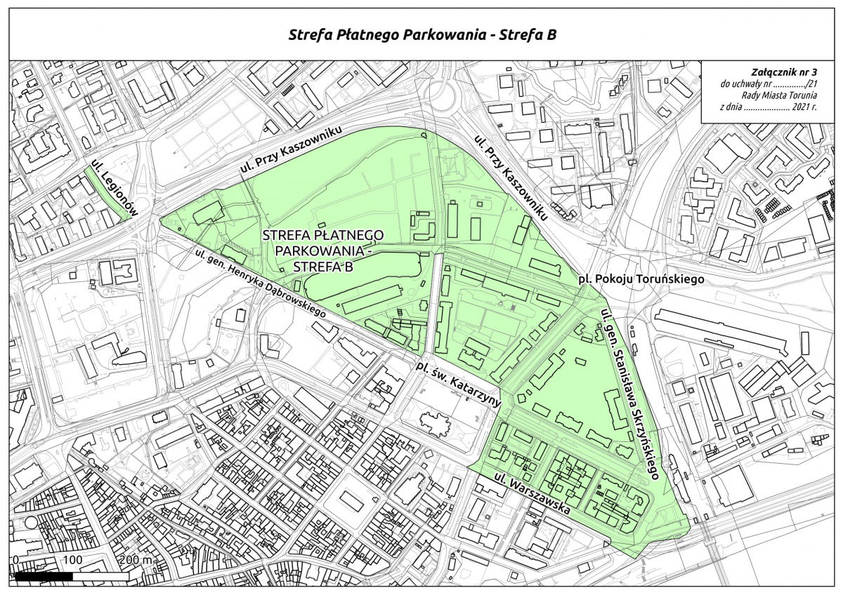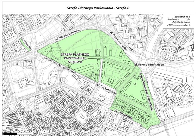 • Strefę Płatnego Parkowania - B, obejmującą obszar ograniczony następującymi ulicami: pl. Św. Katarzyny (wschodnia i północna pierzeja), inż. arch. Kazimierza Gregorkiewicza (na odcinku od ul. Wały gen. Władysława Sikorskiego do pl. bp. Chrapka), gen. Henryka Dąbrowskiego, Przy Kaszowniku, pl. Pokoju Toruńskiego - z wyłączeniem tych ulic oraz gen. Stanisława Skrzyńskiego, pl. 18 Stycznia, Warszawska - wraz z tymi ulicami, a także ul. Legionów (na odcinku od ul. Grudziądzkiej do ul. Odrodzenia).