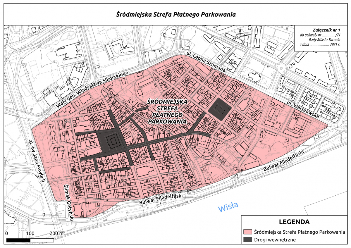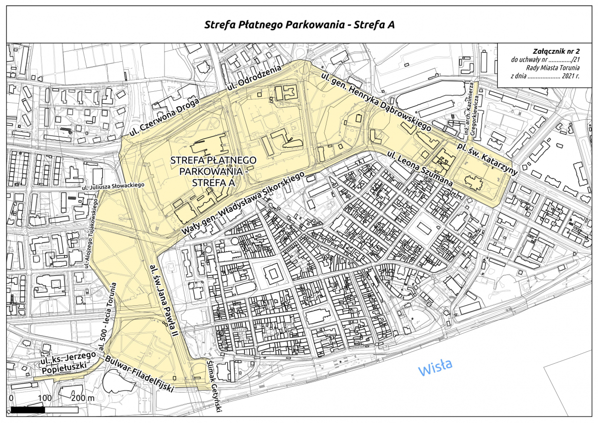 • Strefę Płatnego Parkowania - A, obejmującą obszar ograniczony następującymi ulicami: Bulwar Filadelfijski (na odcinku od ul. Ślimaka Getyńskiego do al. 500-lecia Torunia), ks. Jerzego Popiełuszki (na odcinku od ul. Bulwar Filadelfijski do łącznika z ul. Rybaki), al. 500-lecia Torunia, Alojzego Tuj akowskiego, Juliusza Słowackiego (na odcinku od ul. Alojzego Tujakowskiego do al. Św. Jana Pawła II), al. św. Jana Pawła II (na odcinku od ul. Juliusza Słowackiego do placu Niepodległości), Czerwona Droga, Odrodzenia, gen. Henryka Dąbrowskiego, inż. arch. Kazimierza Gregorkiewicza (na odcinku od pl. św. Katarzyny do ul. Wały gen. Władysława Sikorskiego), pl. św. Katarzyny, Leona Szumana, Wały gen. Władysława Sikorskiego (na odcinku od ul. Leona Szumana do pl. Artylerii Polskiej), al. św. Jana Pawła II (na odcinku od pl. Artylerii Polskiej do Ślimaka Getyńskiego), Ślimak Getyński - wraz z tymi ulicami.