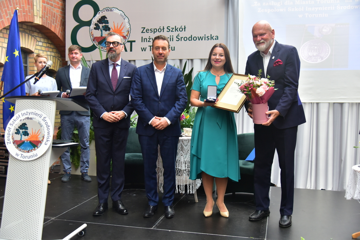 Zespół Szkół Inżynierii Środowiska w Toruniu został uhonorowany Medalem „Za Zasługi dla Miasta Torunia” na wstędze, a wyróżnienie to zostało przyznane na mocy uchwały nr 291/25 Rady Miasta Torunia z 18 września 2025 roku. - Dorobek i zasługi Zespołu Szkół Inżynierii Środowiska w Toruniu jednoznacznie uzasadniają uhonorowanie tej wyjątkowej Placówki najwyższym wyróżnieniem samorządu – Medalem „Za Zasługi dla Miasta Torunia” na wstędze. To wyraz wdzięczności i głębokiego uznania społeczności Torunia dla instytucji, która od ośmiu dekad nieprzerwanie kształtuje kolejne pokolenia, wiernie służąc edukacji, wychowaniu i dobru wspólnemu – mówił Wiceprzewodniczący Rady Miasta Torunia Marcin Czyżniewski. - Niech to wyróżnienie stanie się nie tylko hołdem dla wspaniałej historii i bogatego dorobku Szkoły, lecz także inspiracją do dalszego rozwoju, podejmowania nowych wyzwań i budowania przyszłości opartej na wiedzy, tradycji i odpowiedzialności.