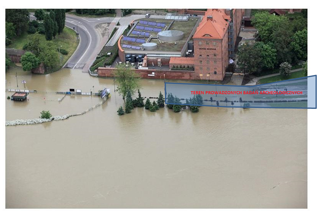 Tutaj warto zaznaczyć, że podczas powodzi z 2010 roku rzędna wody wyniosła 40,54 mnpm. Przy czym rzędna wody 10-letniej wynosi 39,79 mnpm, a rzędna wody 100-letniej 41,13 mnpm. Z kolei rzędna dna wykopu badań to 35,74 mnpm, a rzędna górnej warstwy murów to 38,70 mnpm. Oznacza to, że obszar, na którym prowadzone były prace archeologiczne, może w całości znaleźć się pod wodą.