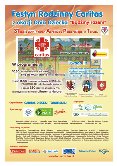 W sobotę 31 maja Caritas diecezji toruńskiej zaprasza wszystkie dzieci na toruńskie lotnisko na Festyn Rodzinny „Bądźmy razem”. Festyn przygotowano dla 15 tysięcy najmłodszych torunian, na których czekać będzie około 250 różnorodnych atrakcji.