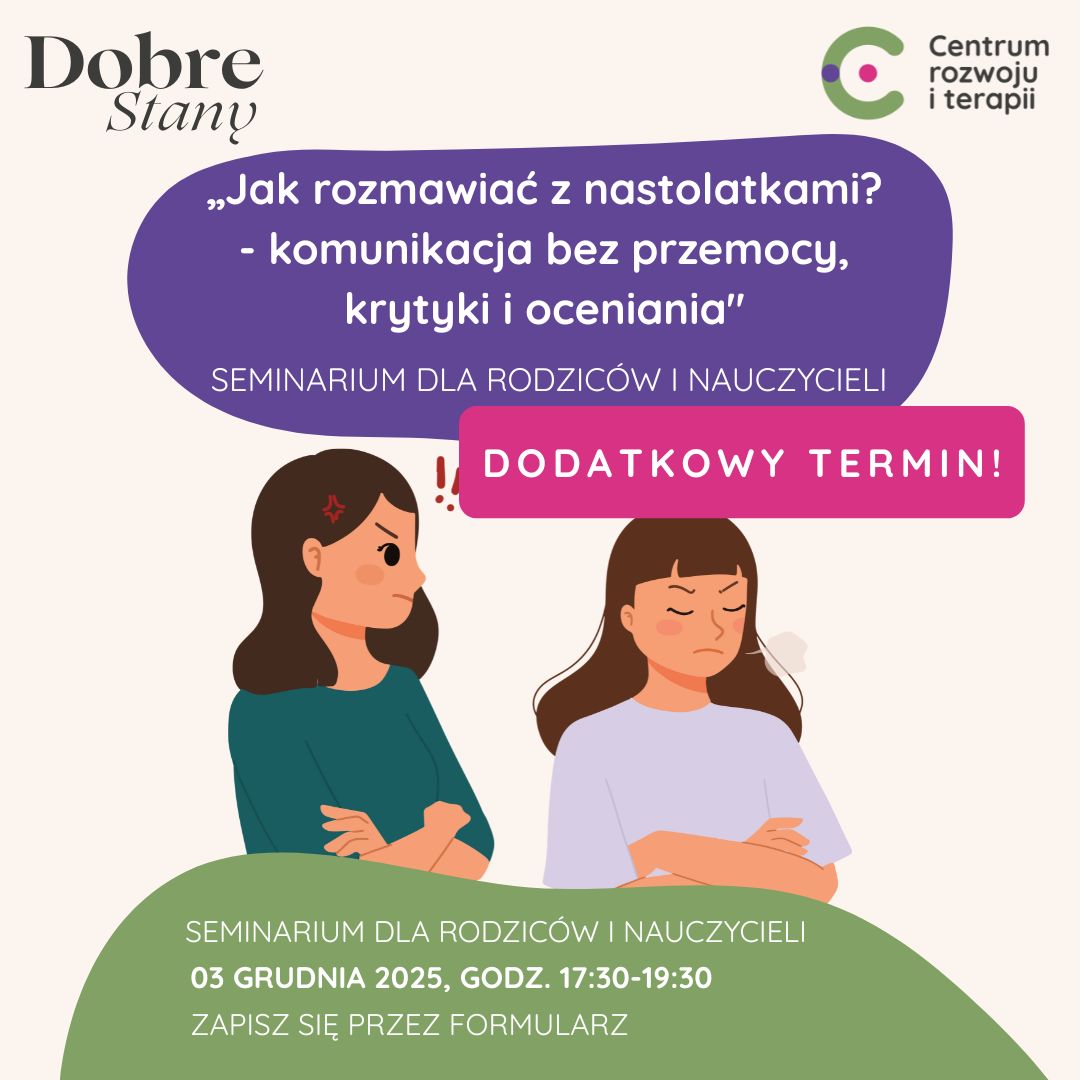 W środę, 3 grudnia 2025 roku w godz. 17:30 - 19:30 odbędzie się seminarium poświęcone budowaniu dobrej komunikacji z nastolatkami „Jak rozmawiać z nastolatkami – komunikacja bez przemocy, krytyki i oceniania”. Obowiązują zapisy.