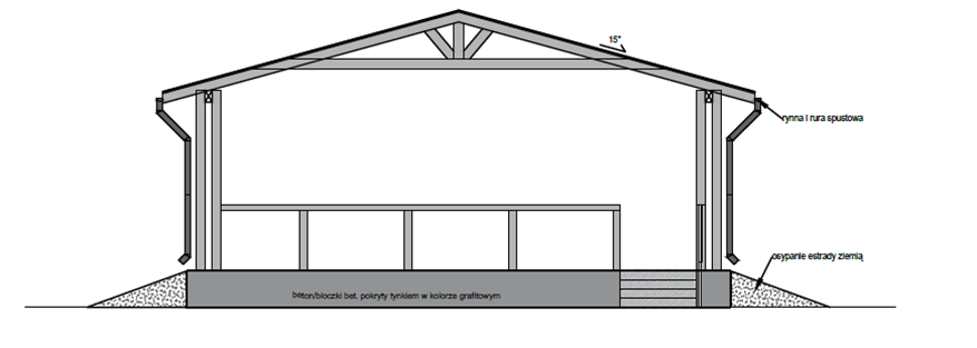 1) Koncepcja nr 1 przewiduje zbudowanie sceny większej – zarówno objętościowo, jak i metrażowo. Zaprojektowano podwyższenie, schodki wejściowe z boku oraz z tyłu sceny. Dach ma zostać pokryty blachodachówką, konstrukcja z pełnym deskowaniem. Wokół podwyższenia przewidziano osyp ziemny, a przed sceną utwardzenie.