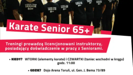 Zajęcia Senior 65+, realizowane dzięki wsparciu Gminy Miasta Toruń, to doskonały sposób aktywizacji osób starszych. Ćwiczenia, prowadzone przez instruktorów posiadających wieloletnie doświadczenie w pracy z najdojrzalszymi adeptami sztuk walki, są dobierane z delikatnością i uważnością na schorzenia, z jakimi borykają się trenujący. Karate dla tej, jakże specyficznej grupy wiekowej, to głównie ćwiczenia ogólnorozwojowe i wzmacniające. Seniorzy uczą się podstawowych chwytów i bloków, jednakże dalekie jest to od wyobrażenia „rzucania na matę” i ruchów niczym Bruce Lee. Treningi odbywają się w spokojnej atmosferze, która sprzyja integracji i zawieraniu nowych przyjaźni wokół wspólnej pasji. Duży nacisk stawiany jest na wyciszenie, metody skupiania uwagi, techniki rozluźniające oraz relaksacyjne. Pomaga to naszym Seniorom w codziennym funkcjonowaniu i poprawia sprawność intelektualną.