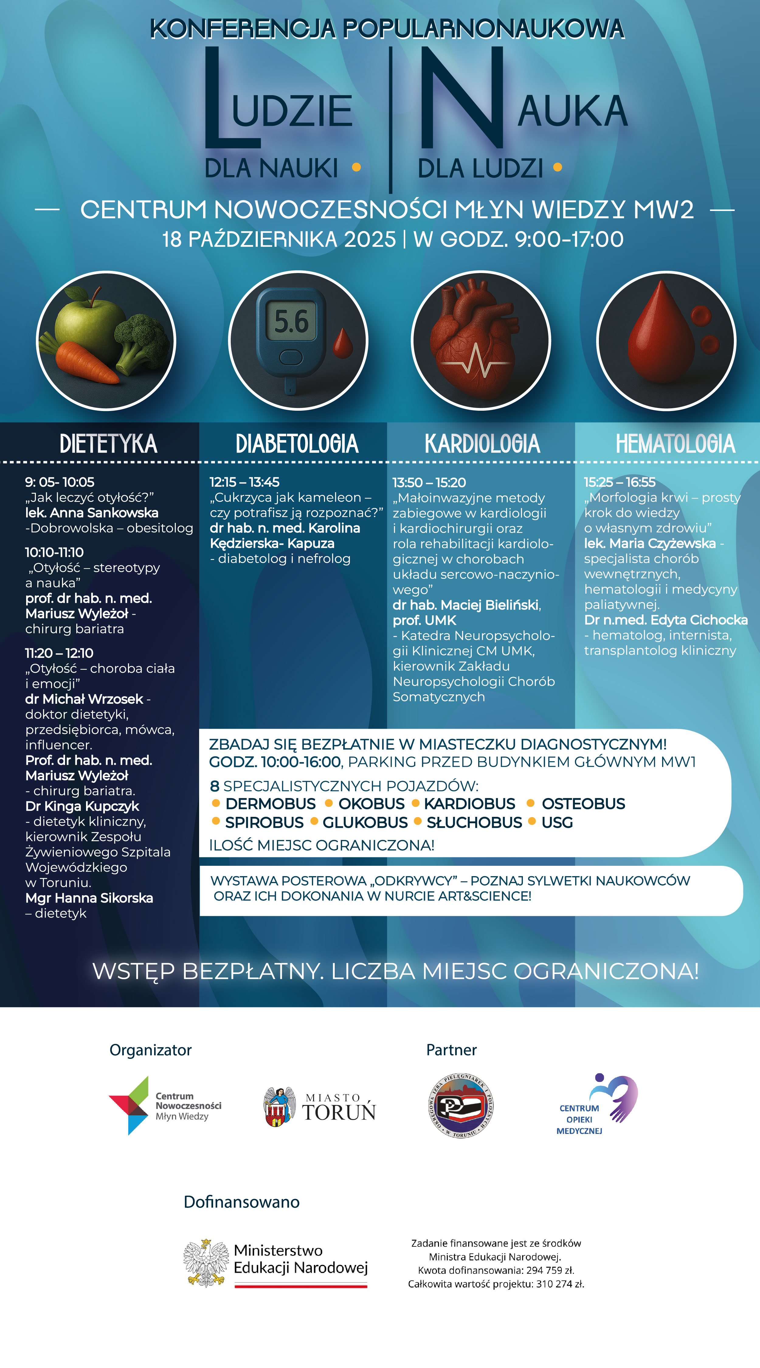 Organizatorem konferencji "Ludzie dla Nauki, Nauka dla Ludzi" jest Centrum Nowoczesności Młyn Wiedzy oraz Gmina Miasta Toruń. Partnerem jest Okręgowa Izba Pielęgniarek i Położnych oraz Centrum Opieki Medycznej w Toruniu. Wydarzenie odbędzie się w ramach Programu "Odkrywcy", dofinansowanego przez Ministerstwo Edukacji Narodowej.