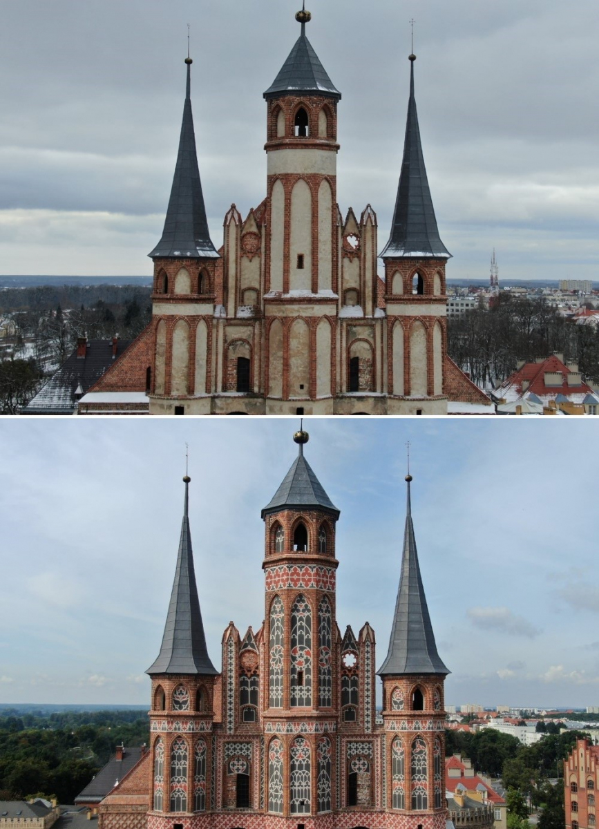 Szczyt wschodni kościoła pw. Wniebowzięcia Najświętszej Maryi Panny przed i po wykonaniu prac