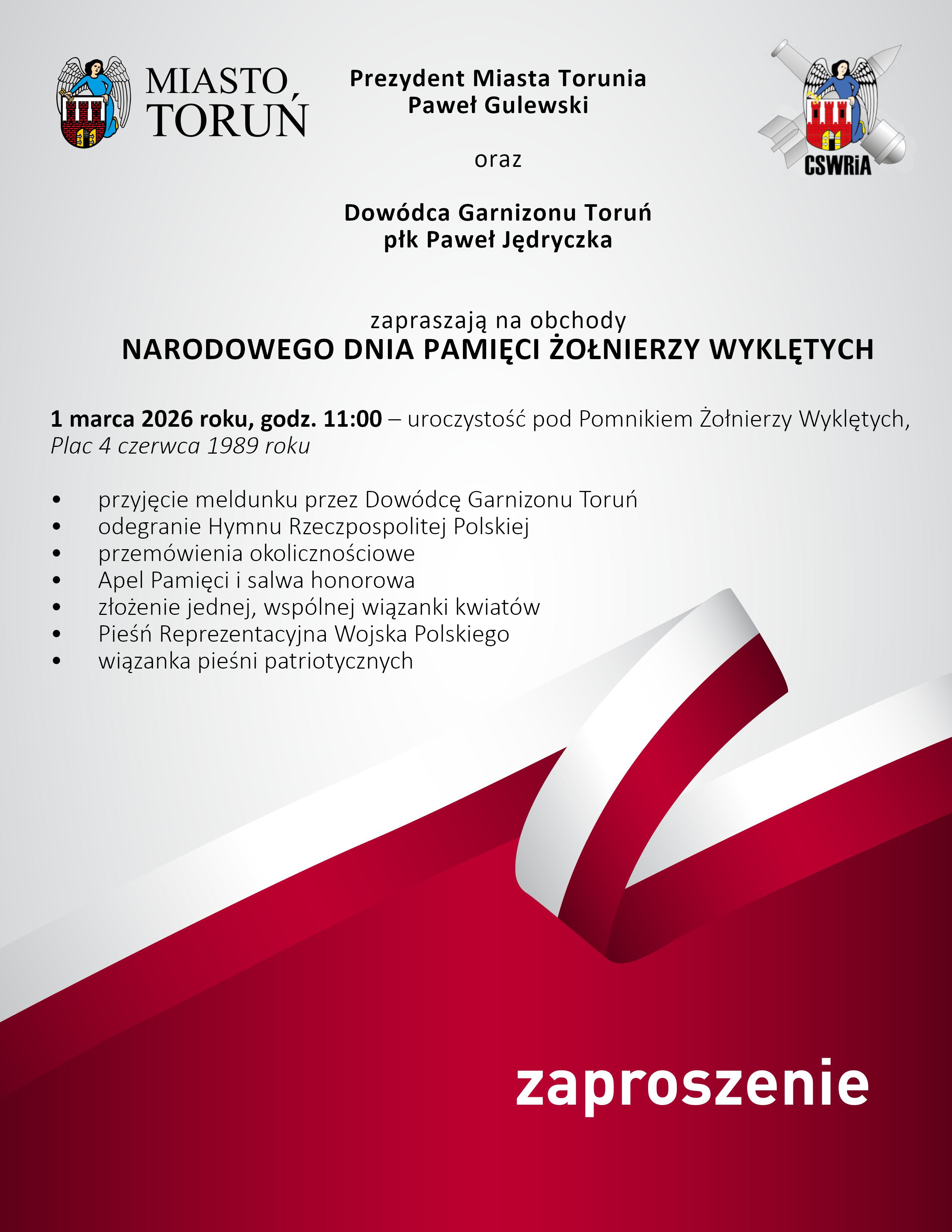 Prezydent Miasta Torunia Paweł Gulewski oraz Dowódca Garnizonu Toruń płk Paweł Jędryczka zapraszają na obchody Narodowego Dnia Pamięci Żołnierzy Wyklętych. Początek uroczystości w niedzielę, 1 marca 2026 roku o godz. 11:00.