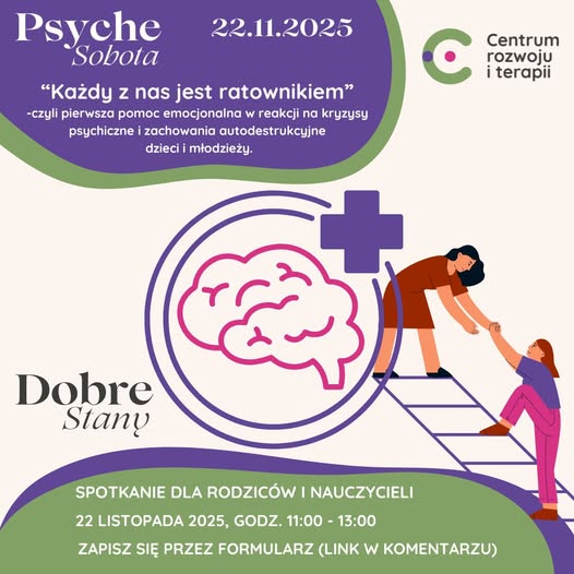 Centrum Rozwoju i Terapii zaprasza rodziców i nauczycieli na bezpłatne spotkanie seminaryjne: „Każdy z nas jest ratownikiem, czyli pierwsza pomoc emocjonalna w reakcji na kryzysy psychiczne i zachowania autodestrukcyjne dzieci i młodzieży”, które odbędzie się 22 listopada 2025 roku. Obowiązują zapisy.