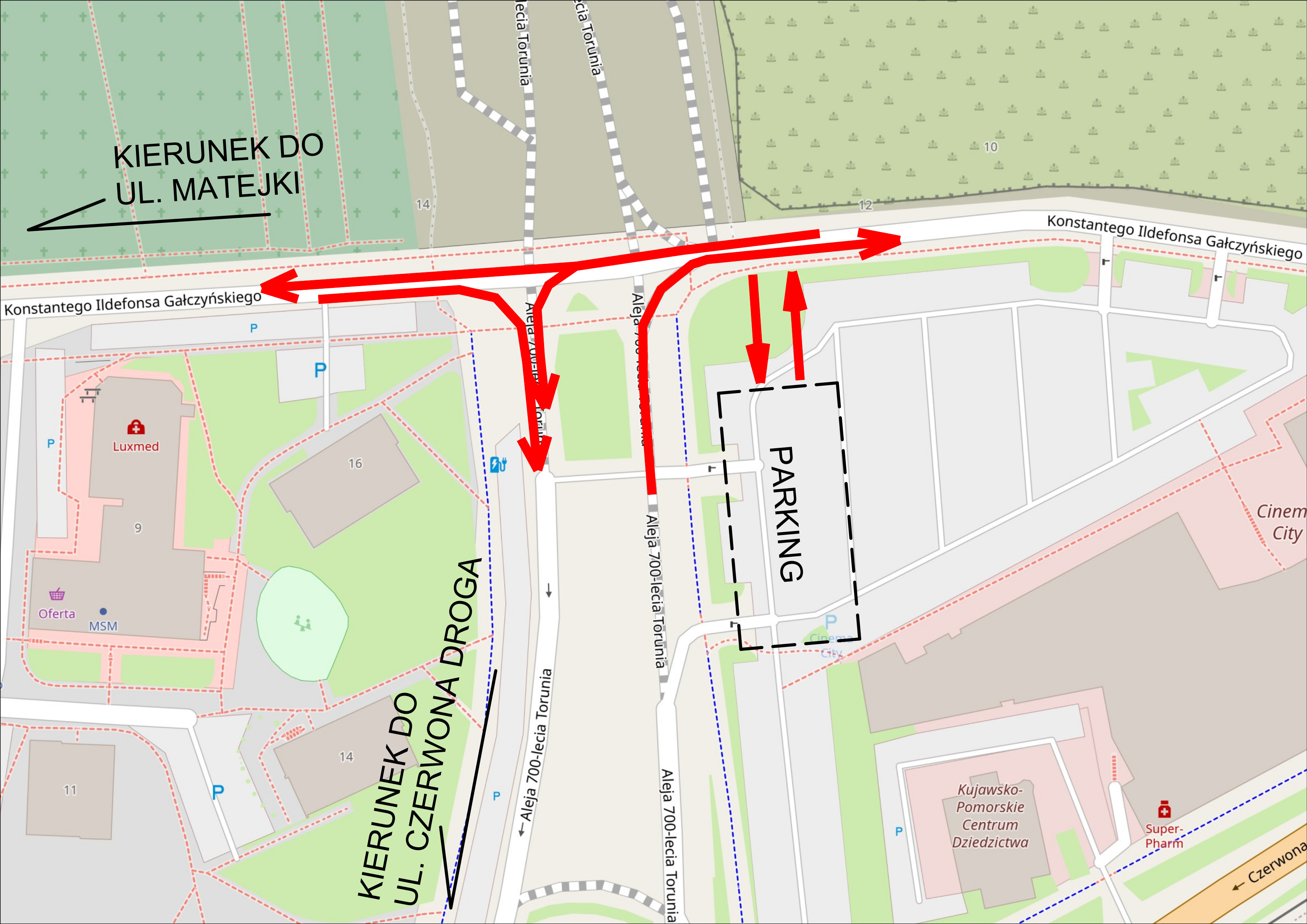 Zmianie ulegnie również sposób wjazdu i wyjazdu z parkingu przy Cinema City. Dotychczasowe zjazdy zostaną zamknięte. Wjazd na parking będzie możliwy nowo wybudowanym zjazdem z ul. Gałczyńskiego. Wyjazd z parkingu odbywać się będzie również ul. Gałczyńskiego, z możliwością jazdy na wprost lub skrętu w lewo w al. 700-lecia.