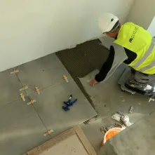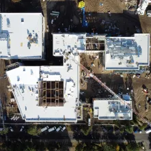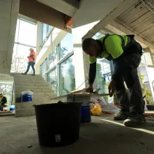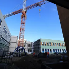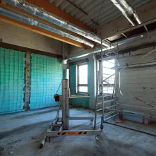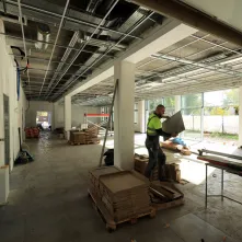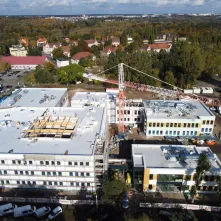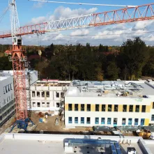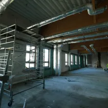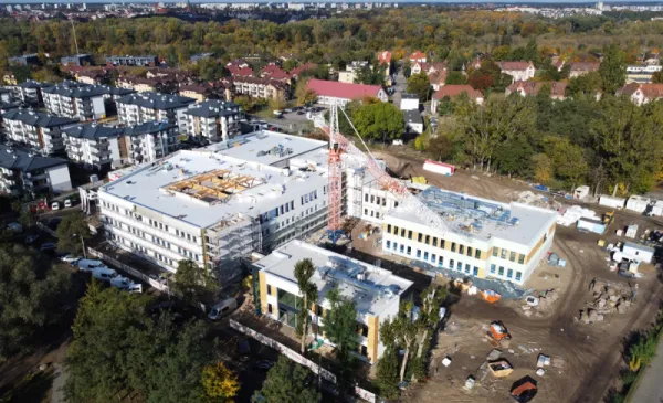 Procentowe zaawansowanie robót wynosi w tej chwili 53%. Budowa uzyskała szczelność dachu, dokonano też montażu stolarki zewnętrznej tak, aby zapewnić możliwość grzania w okresie zimowym i kontynuować roboty wykończeniowe wewnątrz budynków. W pomieszczeniach szkolnych zakończone zostały roboty tynkarskie. Ponadto wykonywane są posadzki. W budynku przedszkola i książnicy położono płytki na ścianach, wykonano posadzkę oraz pomalowano ściany. Pracownicy wyłonionej w przetargu firmy Strabag przygotowali także konstrukcję sufitów modułowych.