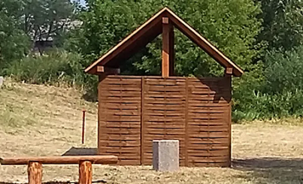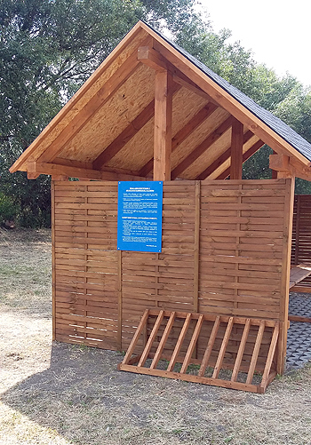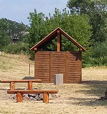Na ląd można zejść z kajaka bezpiecznym zejściem po lekkim sezonowym pomoście pływającym, przy którym może zacumować nawet 10 kajaków. Na brzegu na kajakarzy czeka drewniana wiata, pod którą mogą się schronić przed słońcem i deszczem. Składa się ona z dwóch ażurowych ścian i dwuskośnego dachu, krytego gontem bitumicznym. Zadaszenie zostało wykonane z impregnowanego drewna w kolorze dębu. Podłogę wyłożono ażurowymi płytami z betonu. W środku jest drewniany stół i ławy do siedzenia dla 20 osób.