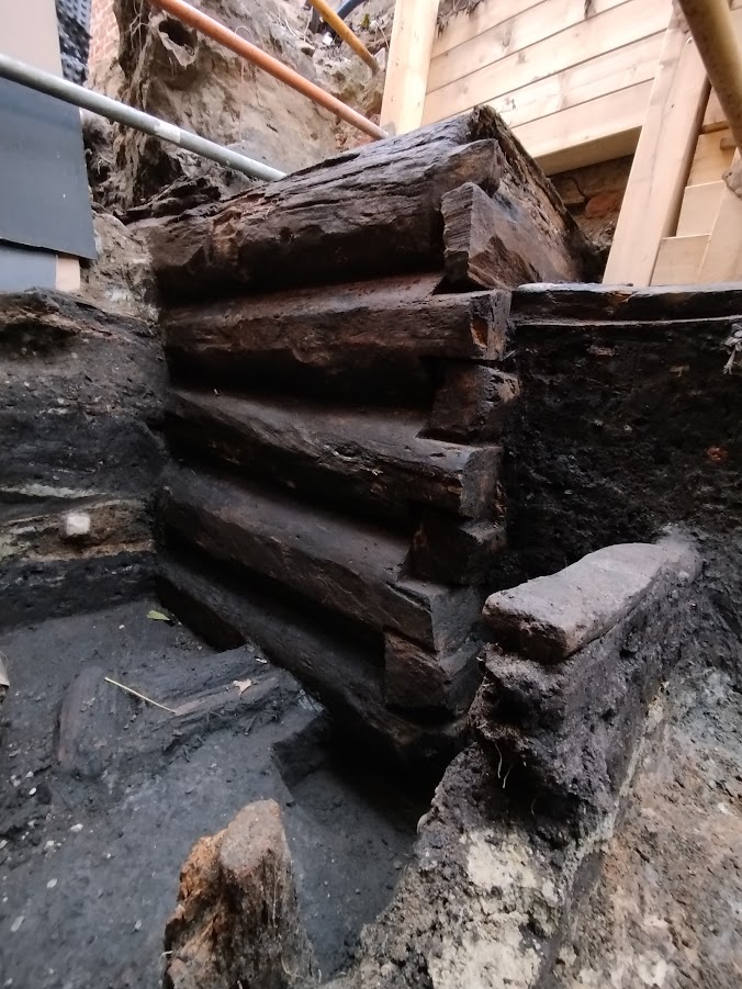 Na wysokości środkowej oficyny odsłonięto zarys drewnianego budynku wzniesionego w technice wieńcowej, z niezwykle dobrze zachowanym węgłem łączonym "na zakładkę". Należy podkreślić, że tej wielkości reliktu drewnianej budowli jeszcze nie odkryto. Odkryte ściany zachowały się do wys. 2,8 m, prawie pełnej wysokości budynku. To rzadkość: relikty drewnianych budowli mieszkalnych z najwcześniejszych faz Torunia praktycznie się nie zachowały, dlatego znalezisko ma znaczenie wyjątkowe nie tylko dla historii Domu Mikołaja Kopernika, lecz także dla badań nad najwcześniejszą zabudową miasta.