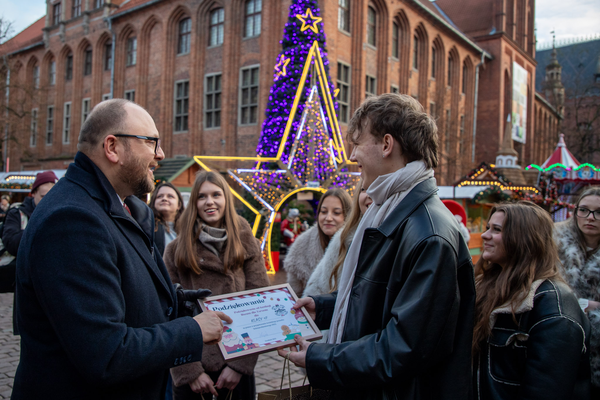Prezydent Torunia Paweł Gulewski podziękował w środę, 10 grudnia 2025 roku, młodzieży z Zespołu Szkół Inżynierii Środowiska za ich zaangażowanie i pracę przy dekorowaniu Jarmarku Bożonarodzeniowego w Toruniu.