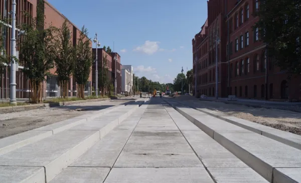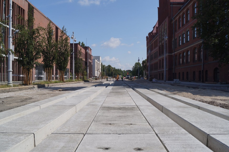 W tym tygodniu na Wałach gen. Sikorskiego rozpoczną się prace związane z wykonaniem płyty podtorzowej wylewanej na mokro. Kontynuowane jest układanie płyt prefabrykowanych na torowisku oraz wykonywanie warstw konstrukcyjnych oraz chodnika wzdłuż Teatru im. Wilama Horzycy. Powstaje także krawężnik od przejścia dla pieszych na wysokości CSW aż do al. św. Jana Pawła II.