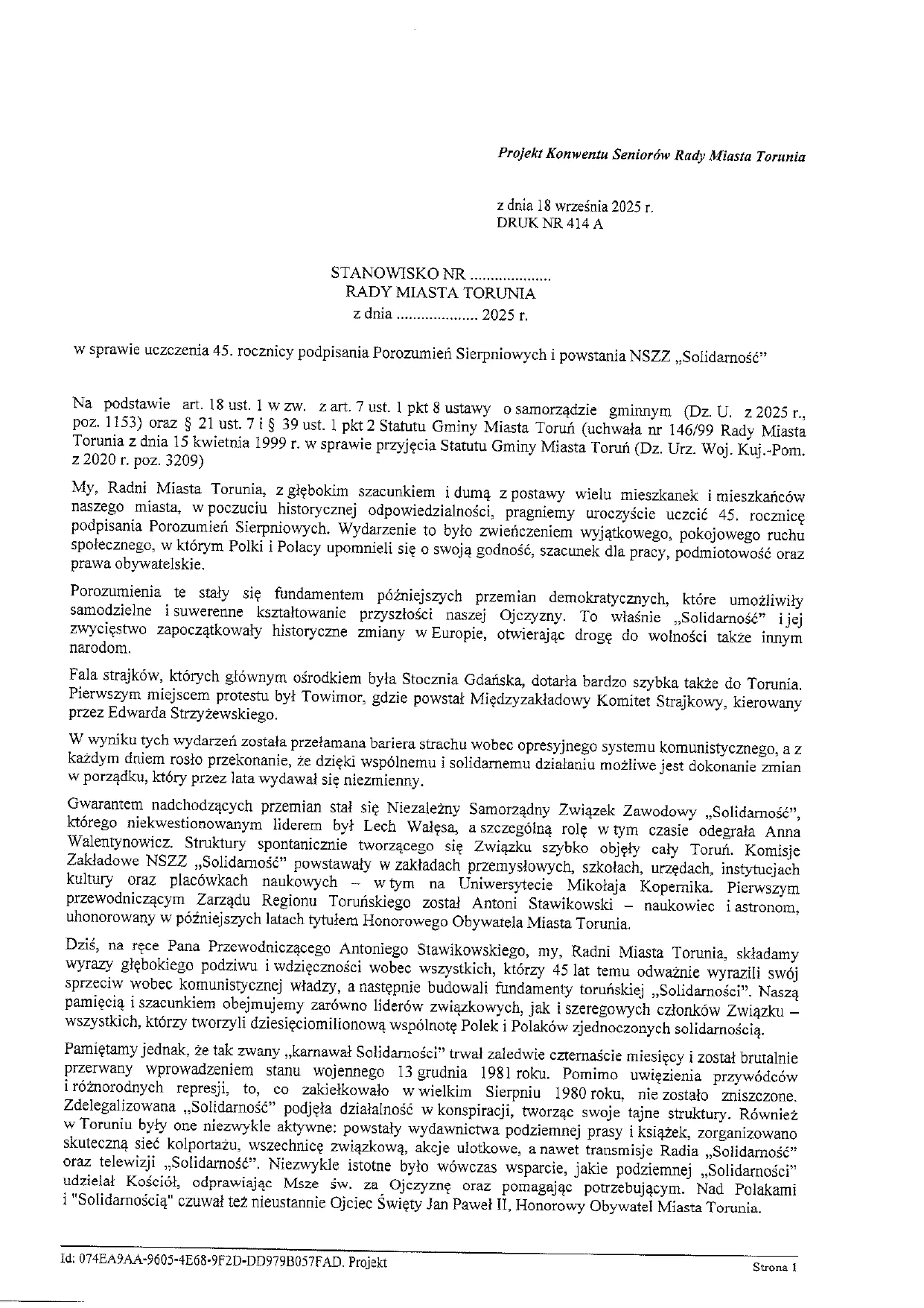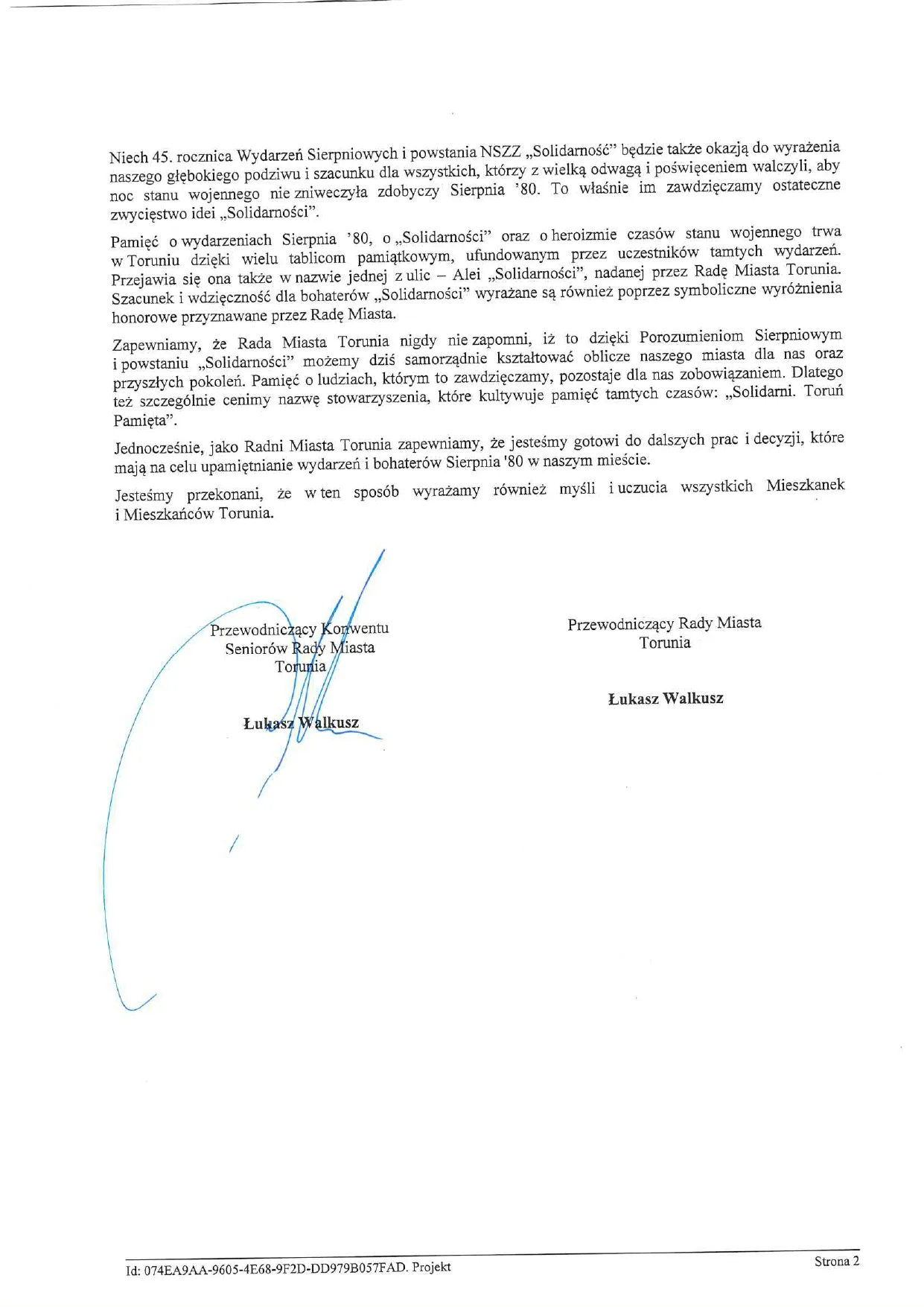 W przyjętym dziś stanowisku czytamy: - My, Radni Miasta Torunia, z głębokim szacunkiem i dumą z postawy wielu mieszkanek i mieszkańców naszego miasta, w poczuciu historycznej odpowiedzialności, pragniemy uroczyście uczcić 45. Rocznicę podpisania Porozumień Sierpniowych. Wydarzenie to było zwieńczeniem wyjątkowego, pokojowego ruchu społecznego, w którym Polki i Polacy upomnieli się o swoją godność, szacunek dla pracy, podmiotowość oraz prawa obywatelskie. Porozumienia te stały się fundamentem późniejszych przemian demokratycznych, które umożliwiły samodzielne i suwerenne kształtowanie przyszłości naszej Ojczyzny. To właśnie „Solidarność” i jej zwycięstwo zapoczątkowały historyczne zmiany w Europie, otwierając drogę do wolności także innym narodom. (…) Zapewniamy, że Rada Miasta Torunia nigdy nie zapomni, iż to dzięki Porozumieniom Sierpniowym i powstaniu „Solidarności” możemy dziś samorządnie kształtować oblicze naszego miasta dla nas oraz przyszłych pokoleń. Pamięć o ludziach, którym to zawdzięczamy, pozostaje dla nas zobowiązaniem. Dlatego też szczególnie cenimy nazwę stowarzyszenia, które kultywuje pamięć tamtych czasów: „Solidarni. Toruń Pamięta”. Jednocześnie, jako Radni Miasta Torunia zapewniamy, że jesteśmy gotowi do dalszych prac i decyzji, które mają na celu upamiętnianie wydarzeń i bohaterów Sierpnia '80 w naszym mieście.