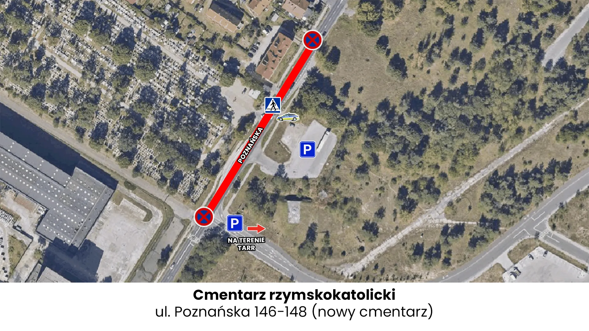 W rejonach cmentarzy przy ul. Poznańskiej po obu stronach drogi będą obowiązywały zakazy zatrzymywania się. Parkowanie pojazdów będzie dozwolone na parkingu poligonu po południowej stronie i drodze dojazdowej do terenów Toruńskiej Agencji Rozwoju Regionalnego, jak również na parkingu przy cmentarzu.