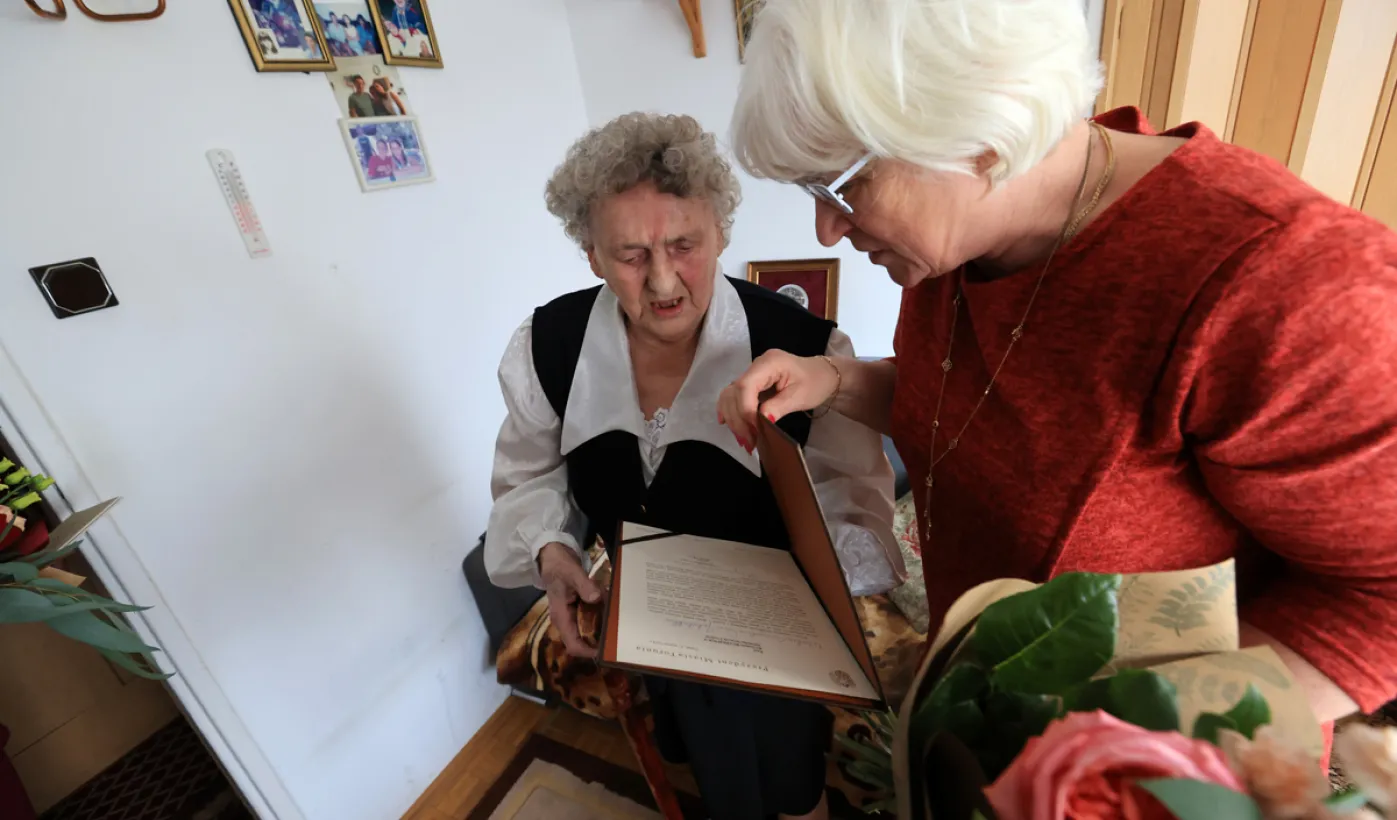 13 marca 2023 r. Prezydent Torunia Michał Zaleski odwiedział Panią Bernadetę Ruszkiewicz, która świętuje swoje 100. urodziny. Nie zabrakło kwiatów, prezentów i wspomnień. / fot. Sławomir Kowalski