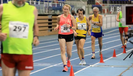 W Arenie Toruń 12 lutego 2022 r. zostały rozegrane 31. Halowe Mistrzostwa Polski w Lekkiej Atletyce Masters. Ponad 500 zawodników z całej Polski rywalizowało w dyscyplinach lekkoatletycznych: biegach, biegach przez płotki i chodach, rzucie kulą, trójskoku oraz skokach w dal i wzwyż. Fot. Sławomir Kowalski