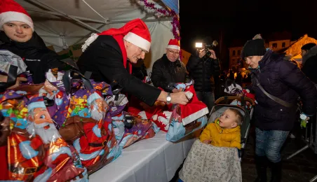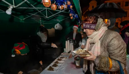 Prezydent Torunia Michał Zaleski oraz duchowni kilku kościołów, w tym rzymsko-katolickiego, grecko-katolickiego, prawosławnego i ewangelicko-augsburskiego złożyli wszystkim przybyłym na plenerową Wigilię Miejską (20 grudnia 2023 r.) bożonarodzeniowe życzenia. Fot. Agnieszka Bielecka