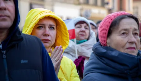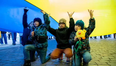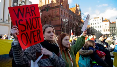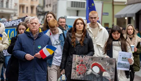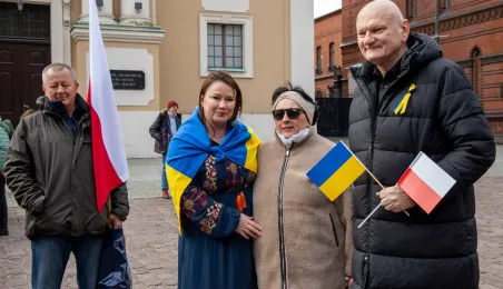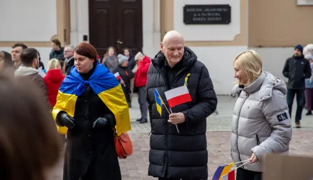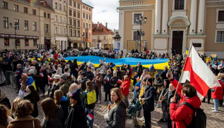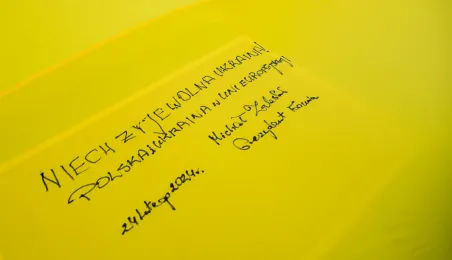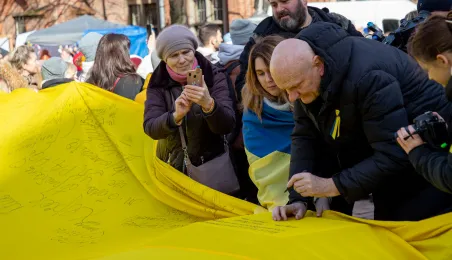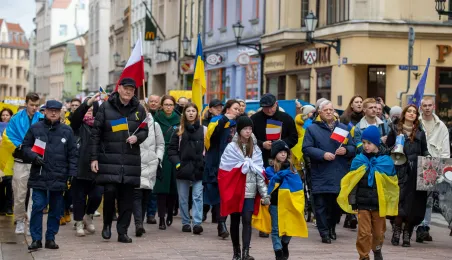 24 lutego 2024 r. w drugą rocznicę wybuchu wojny w Ukrainie obywatele Ukrainy oraz ich polscy przyjaciele przeszli z Rynku Nowomiejskiego ulicą Szeroką do Rynku Staromiejskiego, niosąc żółto-niebieską flagę w ramach Maratonu Solidarności "Flaga życia". W spotkaniu udział wzięli: prezydent Michał Zaleski i mard=szałek województwa kujawsko-pomorskiego Piotr Całbecki. Fot. Agmnieszka Bielecka