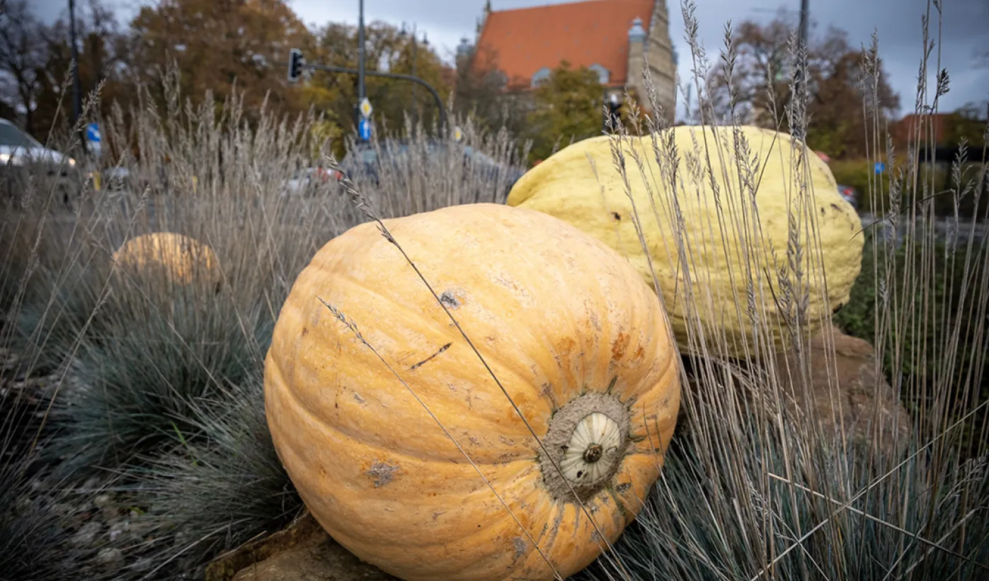 Spacerujący w okolicach starówki dostrzegą w kilku miejscach okazałe dynie. W ten sposób Toruń oswaja jesienny czas.