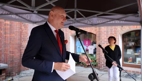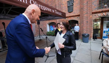 Przedstawiciele wszystkich toruńskich placówek muzealnych spotkali się 2 czerwca 2023 r. na dziedzińcu Ratusza Staromiejskiego w Toruniu z okazji Dnia Muzealnika. Wyróżnieni pracownicy otrzymali nagrody z rąk prezydenta Miasta Torunia Michała Zaleskiego i dyrektor Muzeum Okręgowego Aleksandry Mierzejewskiej. Fot. Sławomir Kowalski