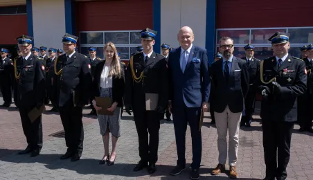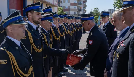 Uroczysta zbiórka z przekazaniem nagród awansów i wyróżnień oraz prezentów od samorządu – tak 31 maja 2023 r. strażacy Komendy Miejskiej Państwowej Straży Pożarnej uczcili swoje branżowe święto. Tradycyjnie z okazji Dnia Strażaka lokalny samorząd o wsparcie sprzętowe Komendy Miejskiej PSP, której działania obejmują zasięgiem nie tylko Toruń, ale i powiat toruński. Od miasta strażacy dostali specjalny lekki samochód kwatermistrzowski – Ford Transit o wartości 245 tys. zł, a od powiatu toruńskiego – kamerę termowizyjną o wartości 30 tys. zł . Na wniosek komendanta miejskiego PSP prezydent Torunia Michał Zaleski uhonorował też 5 strażaków listami gratulacyjnymi nagrodami finansowymi. Fot. Wojtek Szabelski