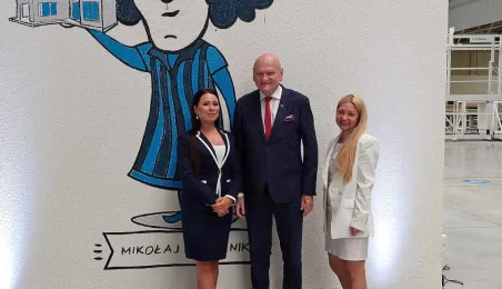 Klara Geywitz - ministra mieszkalnictwa, rozwoju miast i budownictwa Republiki Federalnej Niemiec odwiedziła 30 czerwca 2023 r. fabrykę MOD 21 w podtoruńskim Ostaszewie, w której toruńska firma ERBUD od listopada 2022 r. produkuje drewniane budynki modułowe, przede wszystkim na rynek niemiecki. Na zaproszenie zarządu fabryki gościem spotkania z panią minister był prezydent Torunia Michał Zaleski. Fot. Łukasz Szarszewski