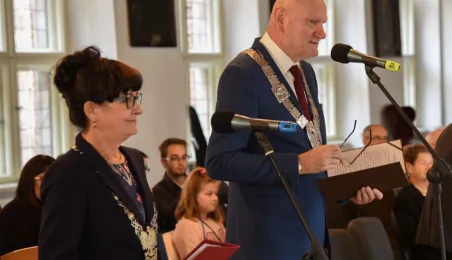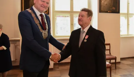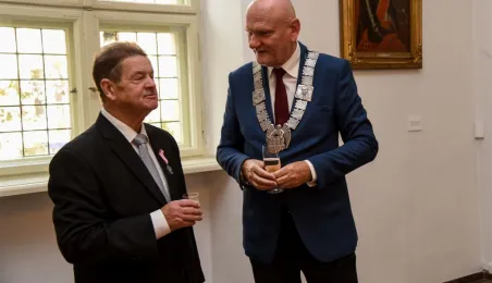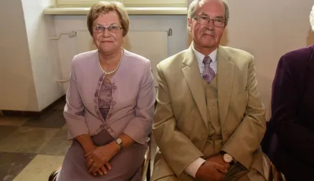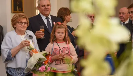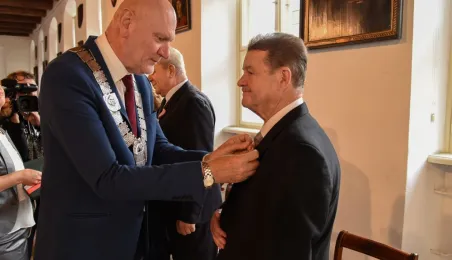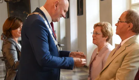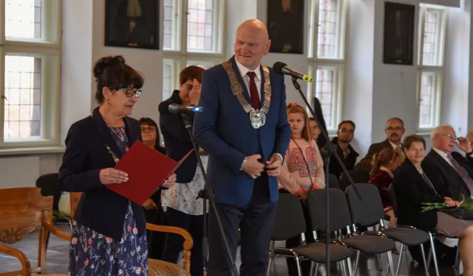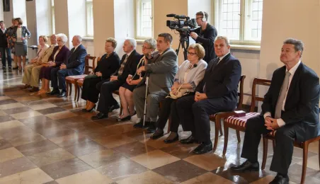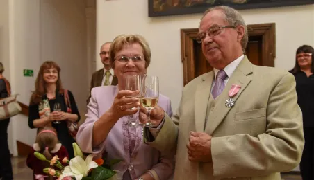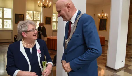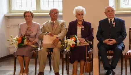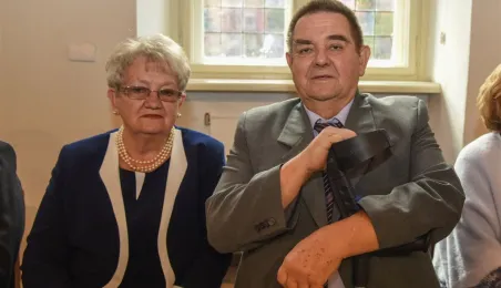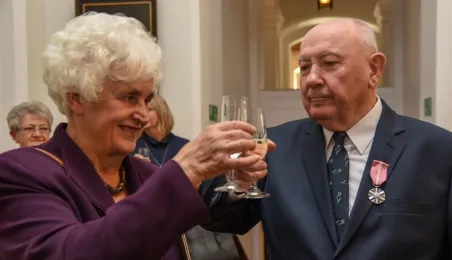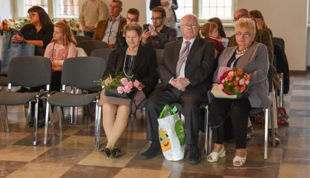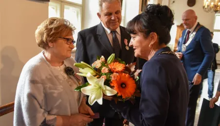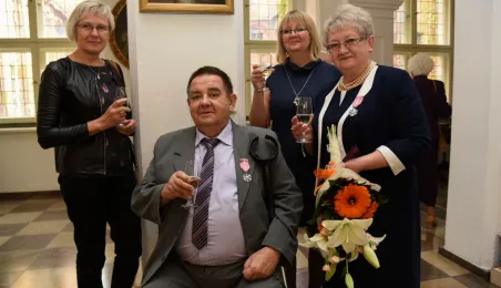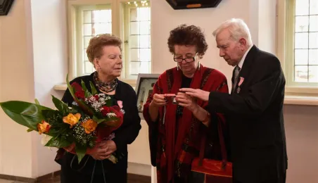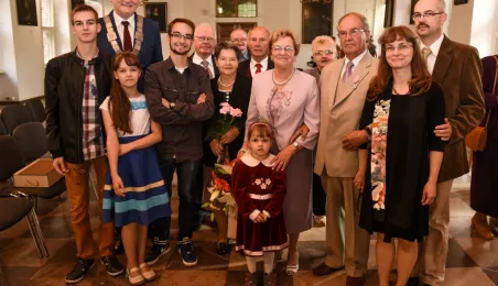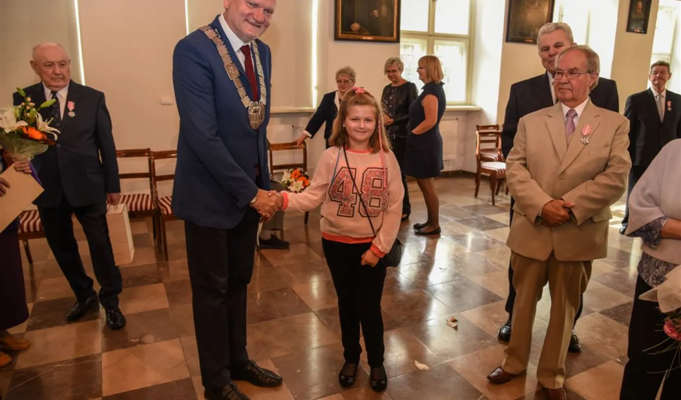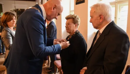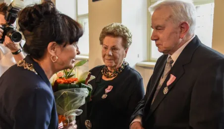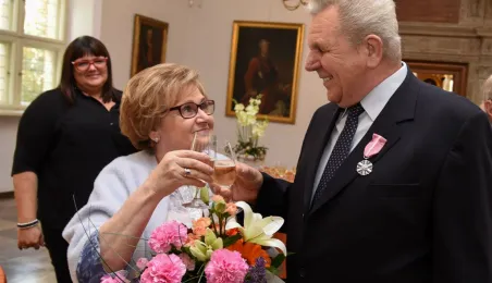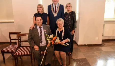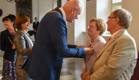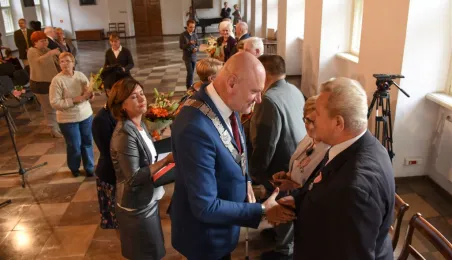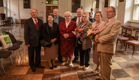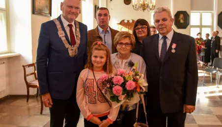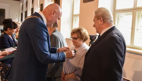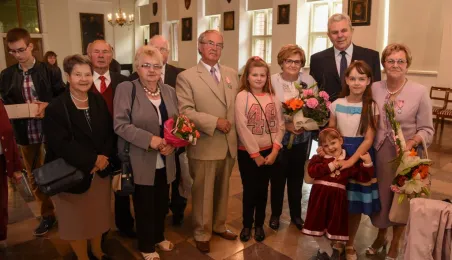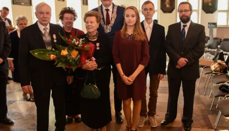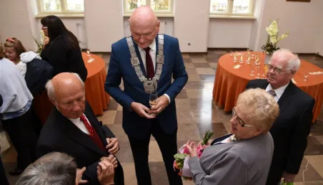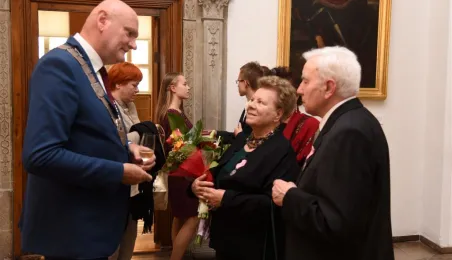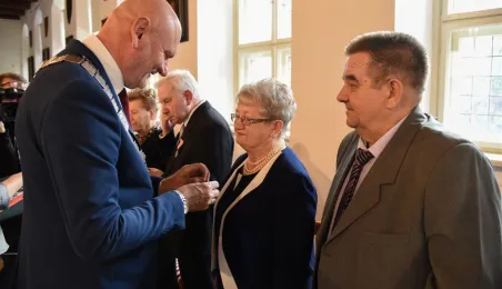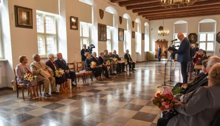 7 toruńskich par świętujących Złote Gody otrzymało 23 września 2016 r. Medale za Długoletnie Pożycie Małżeńskie. Uroczystość odbyła się w Ratuszu Staromiejskim w Toruniu. Medale, nadane małżonkom przez Prezydenta RP, wręczył jubilatom prezydent Torunia Michał Zaleski. Fot. Lech Kamiński