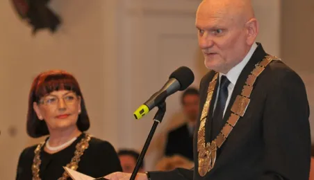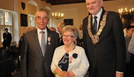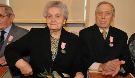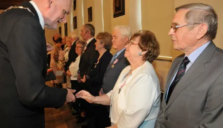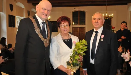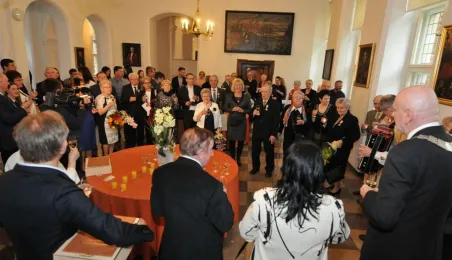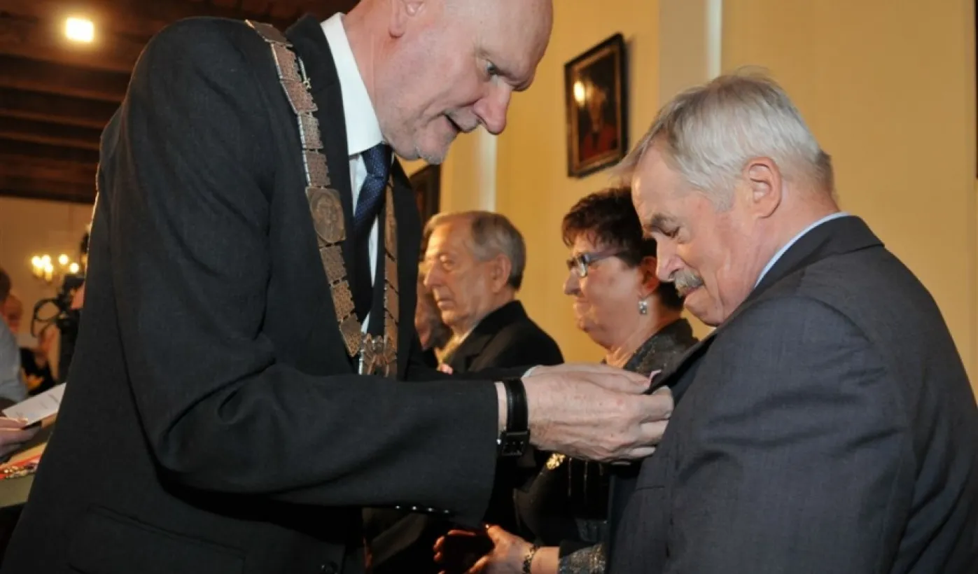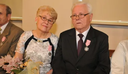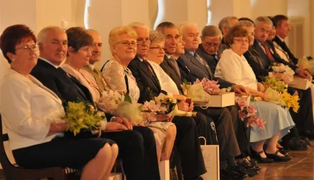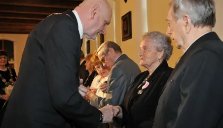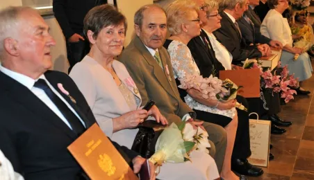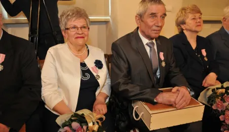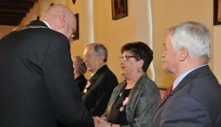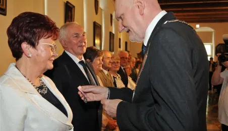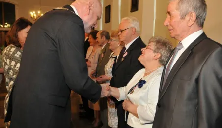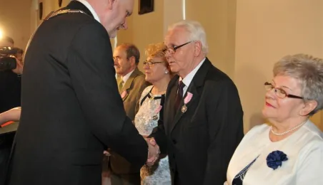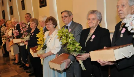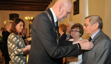 W Ratuszu Staromiejskim w Toruniu dziewięć par małżeńskich świętowało 28 kwietnia 2017 r. jubileusz 50 lat wspólnego życia. Z tej okazji prezydent Torunia Michał Zaleski wręczył im Medale za Długoletnie Pożycie Małżeńskie. Fot. Małgorzata Litwin